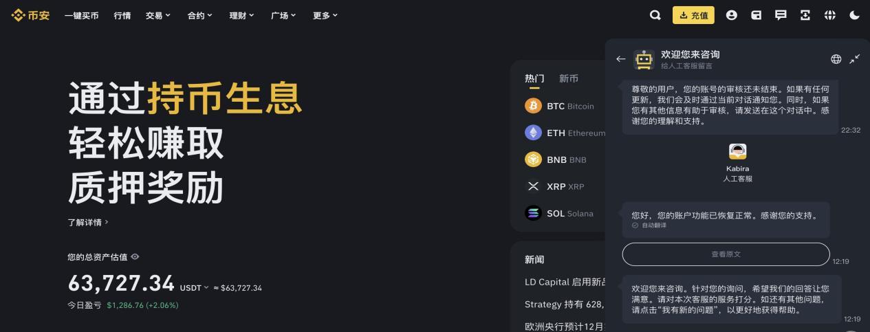 2025 年5 月20 日,一位客户通过社交媒体紧急联系我方团队,称其币安账户内63,879 美元资产突然被冻结。客户表示对冻结原因一无所知,期间曾尝试自行与币安官方沟通,但仅收到模板化回复,未能解决实质问题,反而因申诉方式不当导致账户风控等级进一步升高,资产面临长期锁定风险。