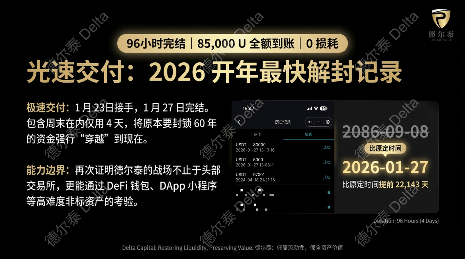 在去中心化钱包与中心化交易所小程序嵌套的复杂生态中,资产风控往往会演变为一场技术与行政的“双重黑箱”。近日,德尔泰(Delta Capital)成功处理了一起跨协议风控积压案件,将一份原本被判为“60年封锁”的资产提前释放,实现了100%的资金安全唤醒。