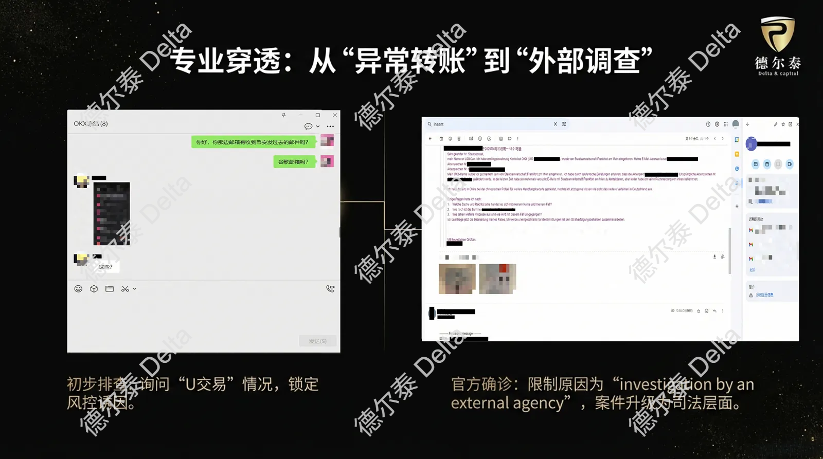 面对严谨的德国司法体系,模糊的申诉毫无意义。德尔泰团队通过多轮排查,锁定案件诱因与链上转账活动有关。