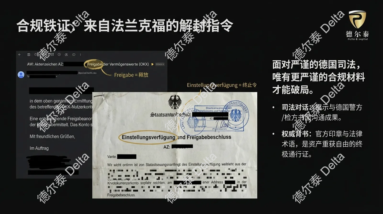 当加密资产遭遇德国制造的严谨合规审查,这不仅是一场法律层面的较量,更是一场关于专业深度与执行耐心的长期博弈。近日,德尔泰(Delta Capital)成功协助客户解决了一起涉及德国联邦及州级司法机构(German Federal/State Authorities)的特大资产受限案。
