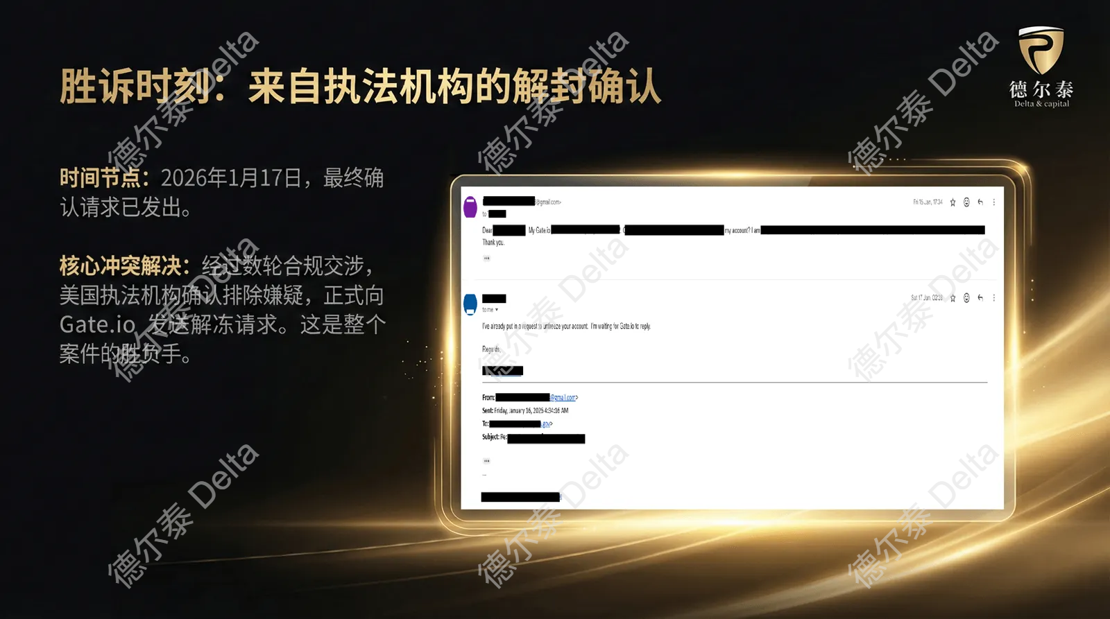 胜诉节点:2026年1月17日,美国执法人员通过邮件正式确认,已向平台方发送解除限制请求(Request to unfreeze)。