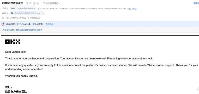 2025年7月7日下午3点半,我司接到一个案件,客户在平台的资金遭到冻结,在根据我司多起okx交易所解冻案例分析,该账户未涉及到7.6与7.7条例,属于平台风控,在此情况下我们与客户沟通并接下该案件。